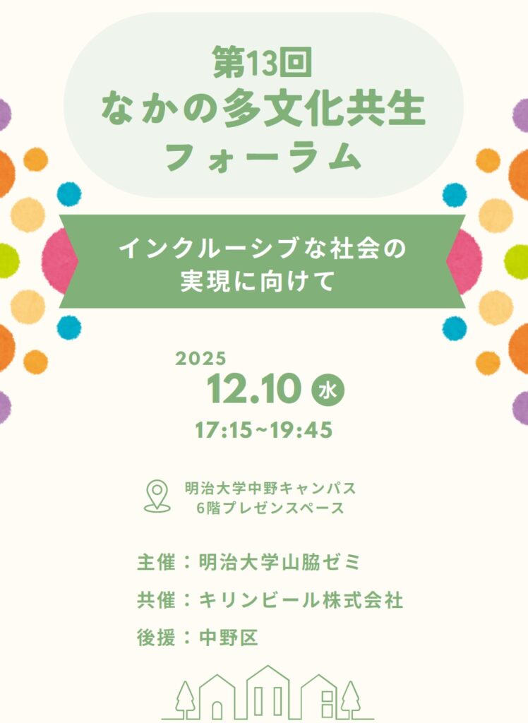 12月10日に、明治大学山脇ゼミ主催の「なかの多文化共生フォーラム」が行われました。今回が13回目となりますが、毎年、その時期に社会に起っているテーマを軸に、さまざまな切り口で組み立てられているフォーラムに、大学生のデザイン力、実行力に感動です。
