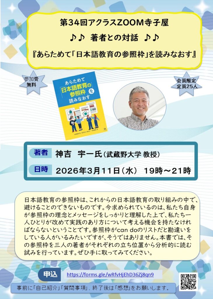 第34回アクラスZOOM寺子屋は、出版されたばかりの『あらためて「日本語教育の参照枠」を読み直す』を取り上げ、<著者との対話>を行います。さまざまな所で取り上げられている「参照枠」ですが、適切に理解されているとは言えない現状があります。対話を通して、改めてみんなで考えてみる時間にしたいと思います。